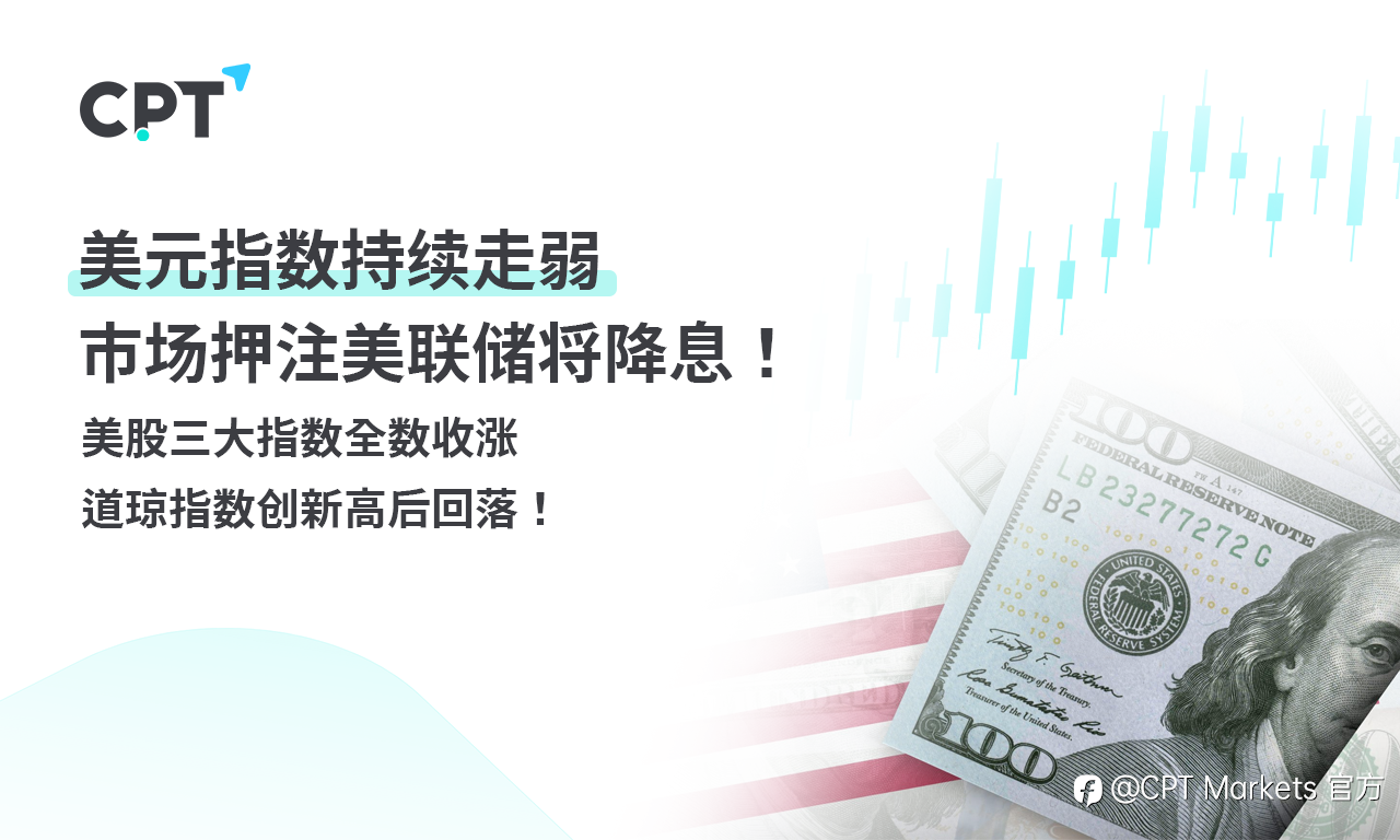 CPT Markets外汇评析:美元指数持续走弱,市场押注美联储将降息!美股三大指数全数收涨,道琼指数创新高后回落!