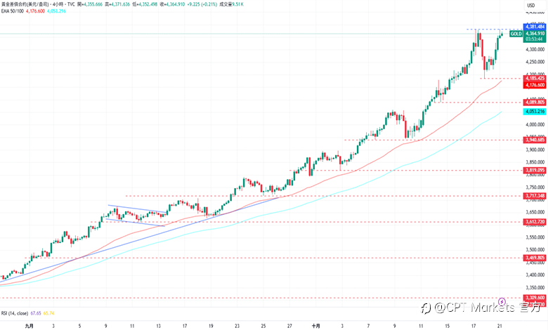 黄金/美元(XAUUSD): 新闻事件: 周一,黄金价格在上涨至4381.48美元。在周五经历大规模抛售后,黄金价格周一重新回到历史高点。美国政府的长期停摆,对美联储10月将降息预期等因素,为黄金价格持续带来支撑。根据CME「FedWatch」工具:美联储10月降息25个基点的机率为99.4%,维持利率不变的机率为0.6%。除了美国的因素,地缘政治也在推动金价走势,此前以色列针对哈马斯涉嫌违反停火协议的行为发动空袭。展望后市,本周美国经济数据发布较少,市场焦点将集中在周五公布的消费者物价指数(CPI)报告。 技术面分析: CPT Markets分析师指出,黄金价格自自4185美元反弹,并重返历