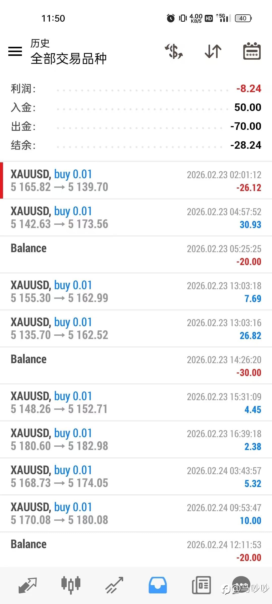 前两周赚了当天的利润,还是手贱再亏完。搞得现在遇到合适的行情,发现目标已经够了,完了不敢了🙃,又是40美金差价的行情,真恶心。所以说,交易的策略还是要有一致性