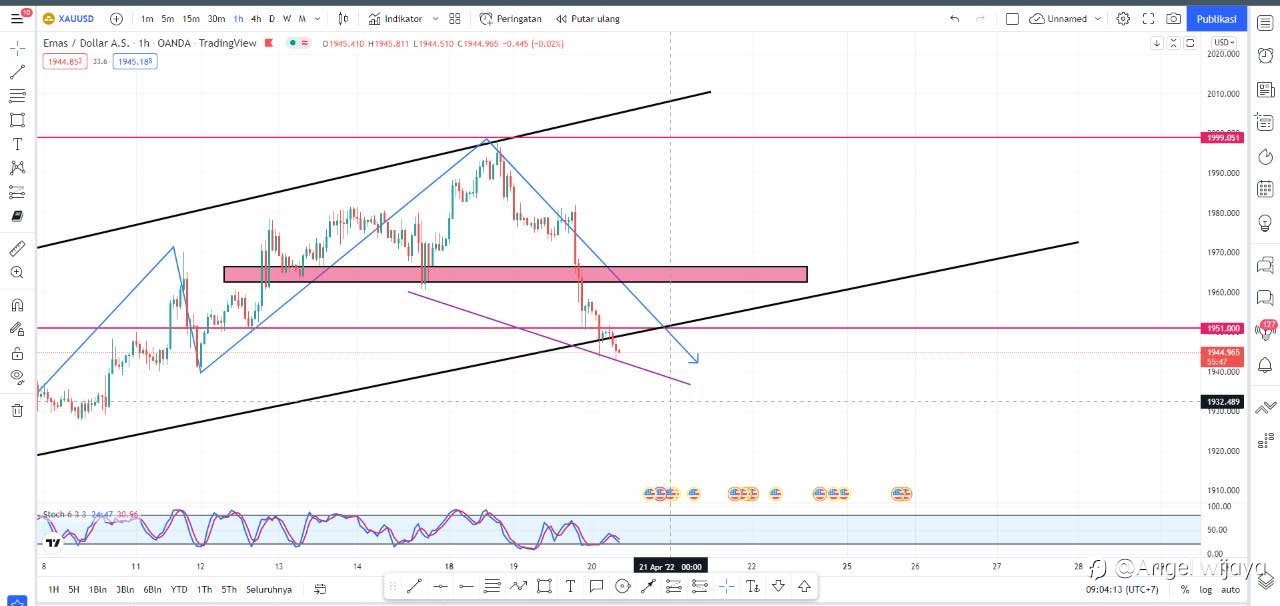 EMAS Harga emas bergerak naik di sesi perdagangan Asia ke level tingginya di $1955.47 karena sentimen pelemahan dollar AS. Emas berpeluang dibeli lebih lanjut siang ini (22/4), menargetkan resistance di $1962 di tengah sentimen pelemahan dollar AS. Namun, jika bergerak turun hingga menembus ke bawah