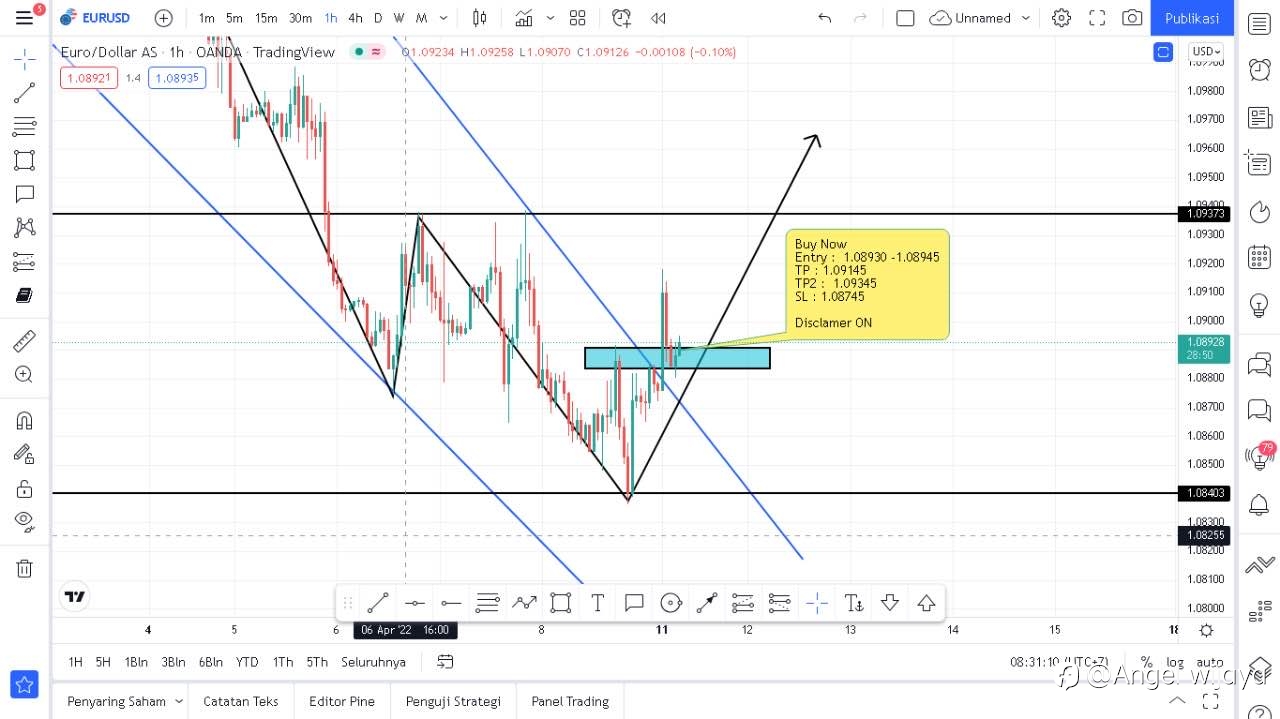 Analisa EURUSD ( 11 April 2022 ) - Dari tampilan chart , EUR sedang mencoba berbalik arah dari bearish ( turun ) ke bullish ( naik ) di karenakan harga sudah jenuh jual dan mencoba berbalik arah membentuk secondary trend .. ada kesempatan buy short.. , jangan lupa pasang SL dan TP untuk menjaga mone