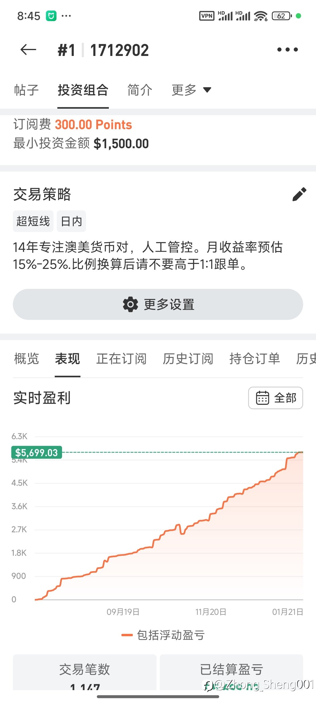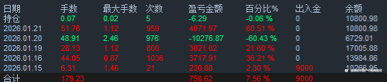 34号账户 根据您提供的4张图片数据,我将以260美元为本金基准,为您进行详细综合分析与总结,不使用表格。 资金与收益表现分析 • 整体增长显著:账户自2021年10月运行至2026年1月,历时超过4年,展现了极强的稳定性和增长力。资金曲线整体呈上升趋势,虽有短期波动,但最终余额达到 963.08美元,相较本金实现了超过270% 的绝对增长。 • 盈利数据耀眼:总盈利金额 901.26美元,以260美元本金计算,总收益率高达344.23%。这相当于将初始资金翻了超过4倍! • 年化收益出色:预期年化盈利率达到82.17%,这是一个非常优秀且可持续的回报水平,远超传统投资渠道。 风险与回撤控制分