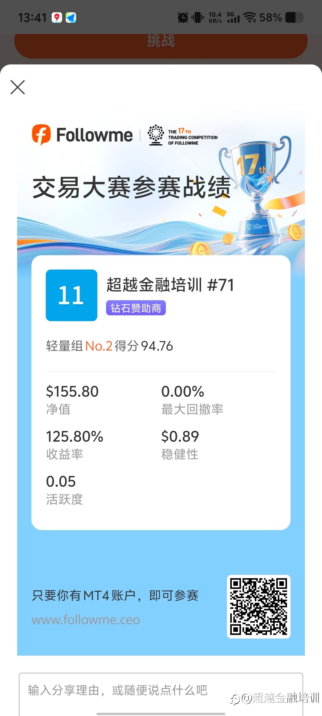 首先要感谢社区提供的平台,让大家进行公平的竞争。第一次参赛,对交易规则不是很清楚,尤其是回撤怎么算不知道。看到别人怎么做分数高,我就学着做。本来以为活跃度是和开单子有关系,后来发现只要 #FOLLOWME交易大赛# 一天有一次交易,活跃度就加1,现在发现活跃度对分值影响的比重其实不算大。大赛的目的其实就是找出优秀的交易员,稳定且浮亏小很重要,优秀的交易员,必须控制好浮亏,不能太大,其实好的交易机会是要等的,不是时时刻刻都有机会,做单还是要做符合自己系统的,不能盲目开单,比赛前期,走了很多弯路,犯了很多错误,导致心态消沉,轻量组中,高手太多了,各种做法的都有