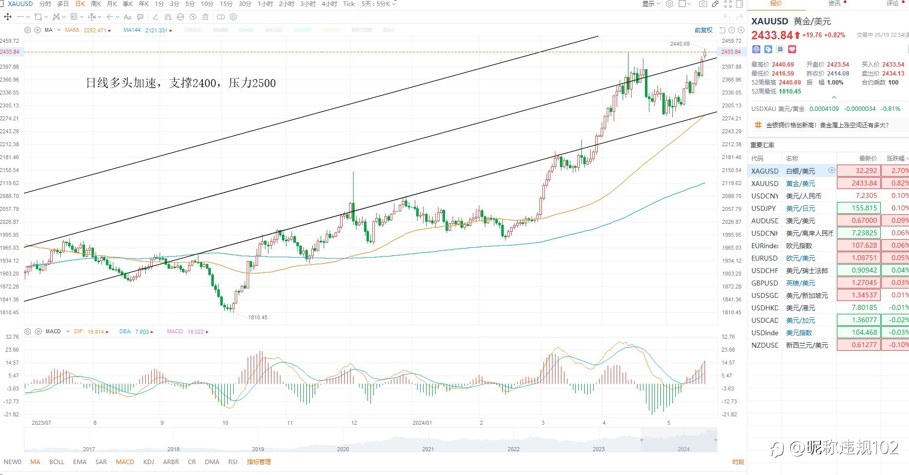 KCM Trade——黄金原油行情分析 2024年05月23日 美元指数小幅反弹,主要是美联储会议纪要偏鹰派言论,表示通胀将相对漫长,因此美元在支撑附近反弹,而美债收益率继续走高,同样支撑美元走高,日内等待压力测试为主...