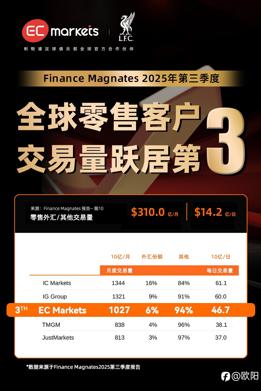 EC Markets受全球顶级监管 一个集极致交易体验、丰富产品和极具竞争力的点差于一体的平台 根据权威机构Finance Magnates发布的2025年第三季度报告 EC Markets的交易量强势跃居全球榜二 网上很多人都在传EC盈利就会被判断为毒瘤订单 作为一家全球交易量榜二是做不成黑平台的 尽管被抹黑或是遭遇争议交易的用户在帖子中公开陈述事实与经过 EC始终以真实数据持续证明自身实力 以下为自己客户的出金记录请查看!