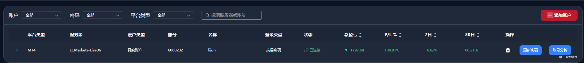 这个月的操作,感觉平平淡淡,心理逐渐能拿的起放的下。 以后就用60美金操作,信号好,就重仓。信号良,就轻仓0.06操作 总的来说,渐入佳境,希望越来越好。