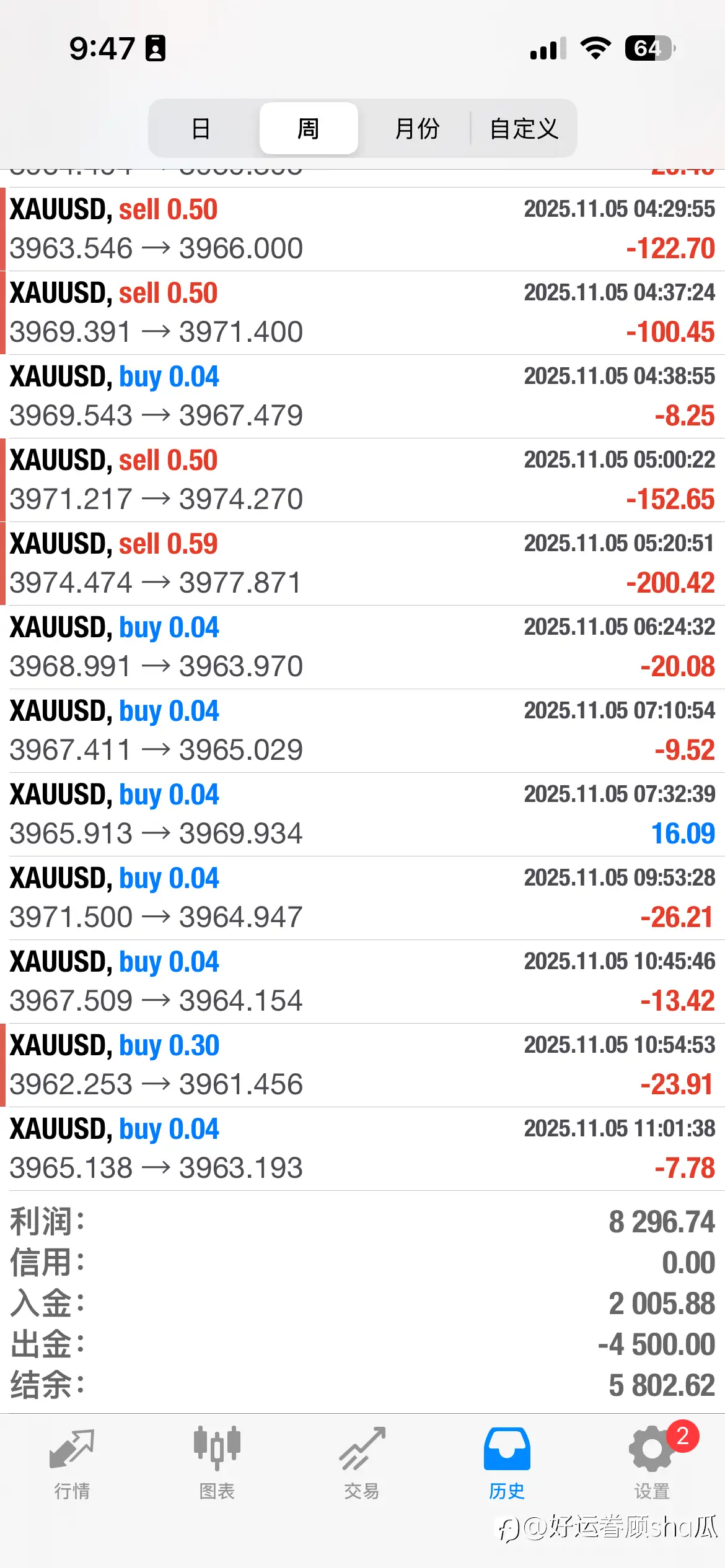 11月3号入金,到今天一周时间! 这个账户是自己艰难的一步,是自己下定决心改变自己的最后一次交易! 这周3,4,交易有点变形了,因为老毛病,因为心态问题,导致害怕亏损和利润回吐。从轻仓到加仓,到重仓止损。 最后一次,绝对不让自己爆仓,如果这个账户爆仓了,自己也就不适合交易了。 虽然自己对自己技术,对自己的系统有信心,但是没有执行纪律,又有什么用呢!没用的! 虽然这周是赚钱的,但是好痛苦,因为自己不争气,心魔一直在作祟,自己还压不下去。让自己预见如果压不下去心魔,长期交易下去,准确率下降的同时,肯定有一波行情会让我一直止损,到最后自暴自弃爆仓!所以,一定要加油,改变自己!
