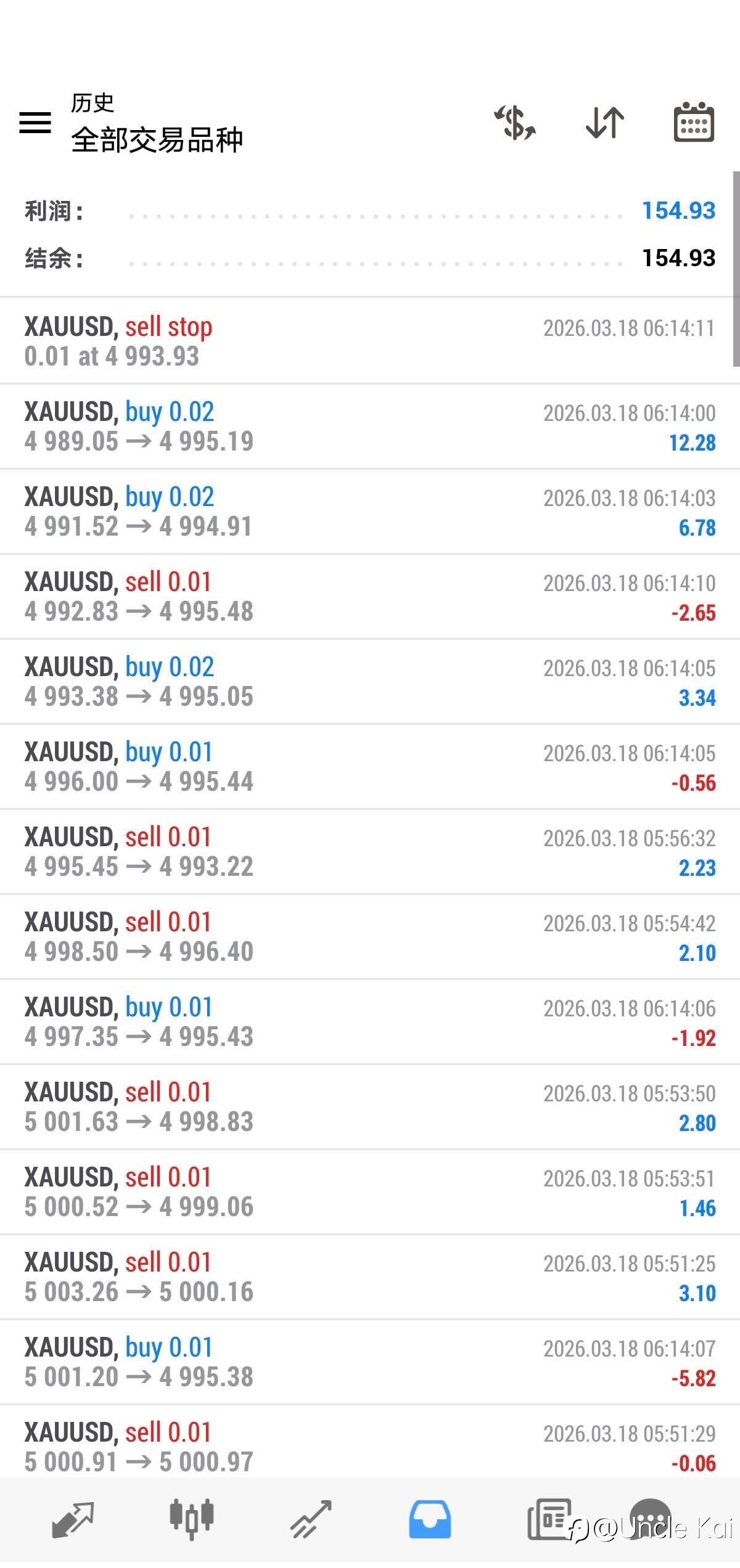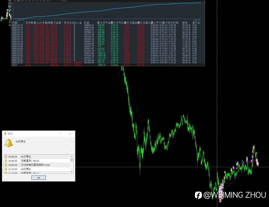 今日3/18黄金算法交易策略完成目标EA自动结束 4小时结束 收工 每日0.15% 月化3% 年化36% 不过度交易 控制自己的人性的贪婪 稳稳的增长