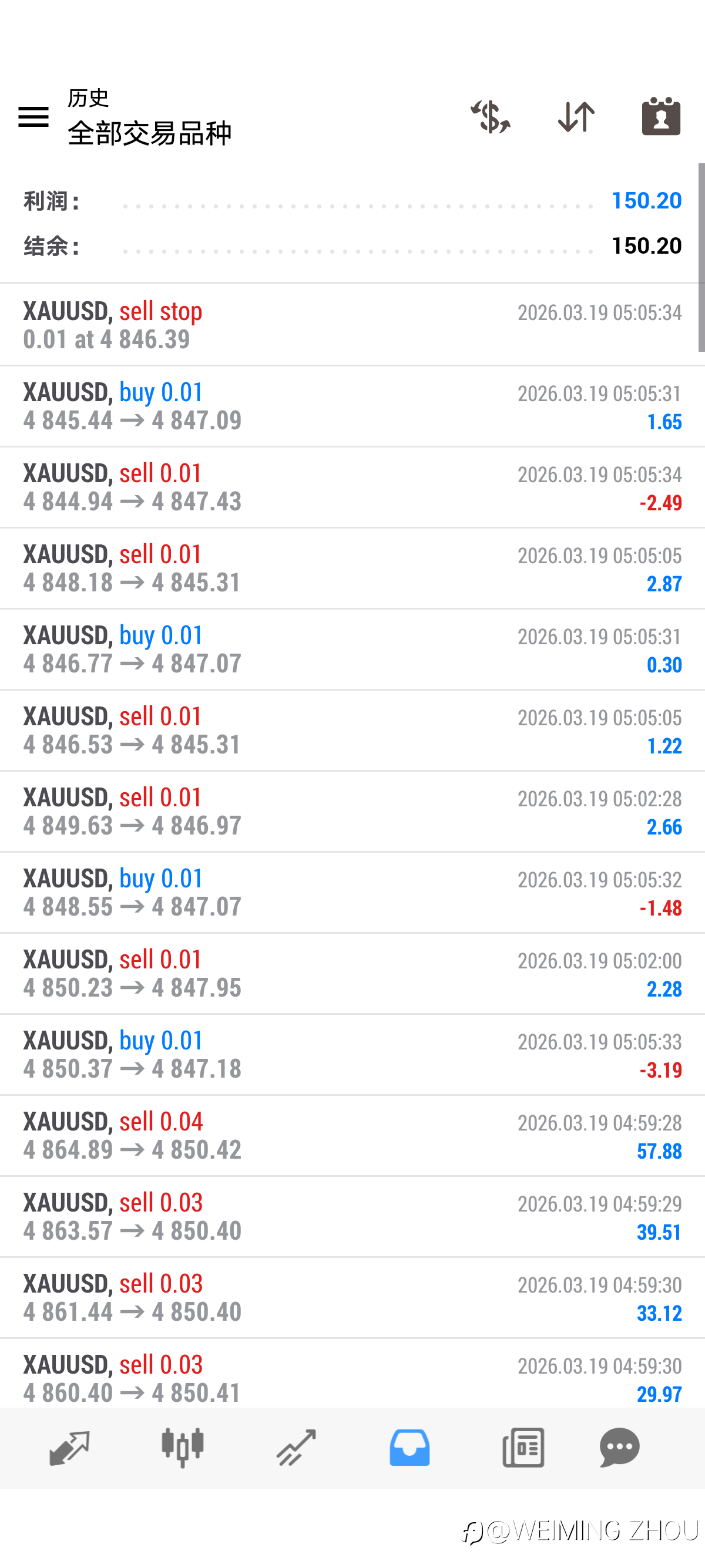 今日3/19黄金算法交易策略完成目标EA自动结束 4小时结束 收工 黄金算法交易策略完成目标EA自动结束 4小时结束 收工每日0.15% 月化3% 年化36%不过度交易 控制自己的人性的贪婪 稳稳的增长
