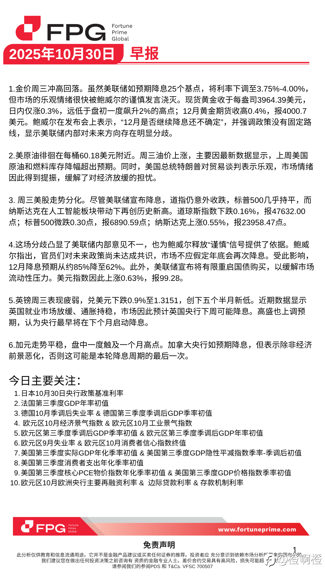 2025年10月9日|FPG金融市场早报 1. 现货黄金突破4050关口,最高触及4059.07美元/盎司,受地缘紧张及降息预期支撑,避险买盘持续增强。 2. 原油价格延续涨势,美原油升至62美元/桶。乌克兰局势未有明显缓和,加之...
