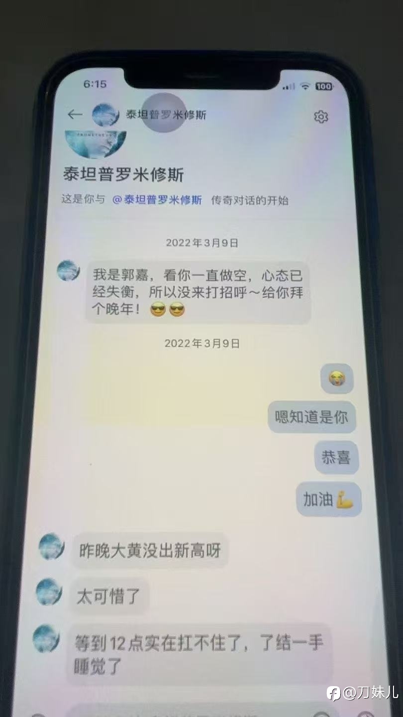 我是2019年来到社区的,刚刚进社区的时候,整个行业欣欣向荣,好不热闹,跟单代单的都特别多,彼时汇聊app里面有个牛人榜里面都特别厉害的风云人物。当然作为韭菜的一员,也和无数人一样经历了新手保护期,然后准备在高杠杠市场一展宏图的时候就快速跌倒,下岸,然后经历了漫长的爬坑过程。 彼时,郭嘉属于头铁大将军,只做多,行情下跌的时候很多人排队看他爆仓,我当时也心想,这家伙怎么这么贪心,几千刀赚几万都不走,家里有矿?当然那段时间他也很少出来聊天晃悠。那几年他在我心里都是神一样的存在,因为我都是赚几百一千就会获利了结,上万刀从来没有想过。他偶尔在行情上涨的时候看到我爆仓了会来宽慰我几句,你还是去上班吧。当