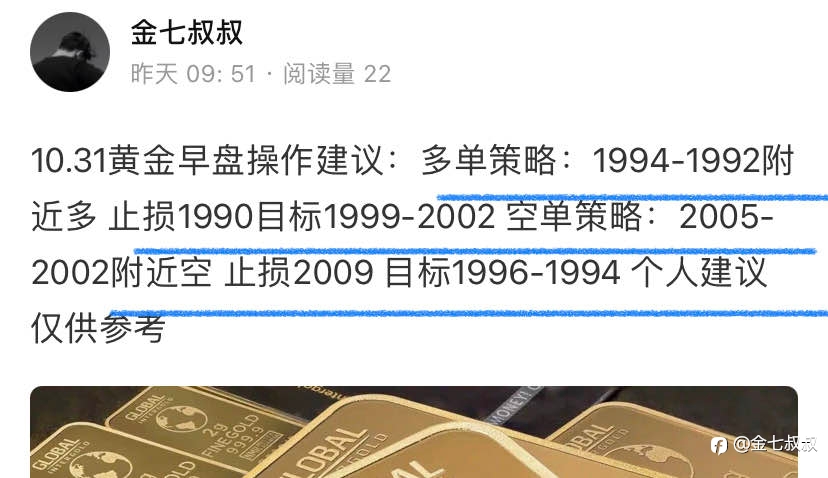 11.22黄金早盘操作建议:反弹高空为主 回调低多为辅 上方压力2001 下方支撑1980 多单策略:1985-1983附近做多 止损1979 目标看1995-1997 空单策略:1998-1996附近空 止损2001 目标1985-1980 破位看1960 个人建议...