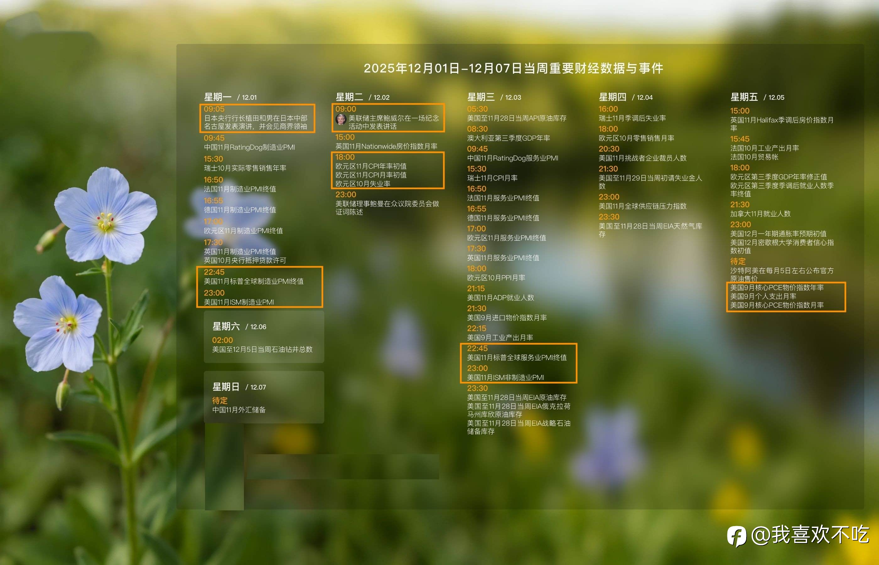【本周新闻数据 12.01-12.07】 重点关注: 周一,日央行行长植田和男讲话,美11月PMI数据 周二,美联储主席鲍威尔讲话,欧元区11月CPI数据 周三,美11月ISM非制造业/服务业 PMI数据 周五,美公布9月PCE物价指数