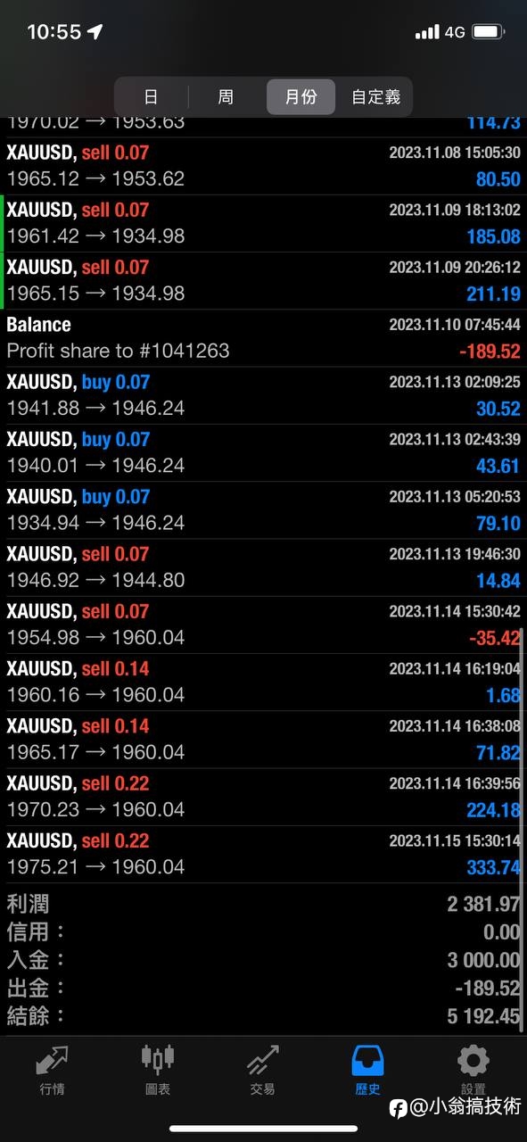 持續賺 這個月剛跟的客戶已經先盈利600了 你慢慢看 我慢慢賺