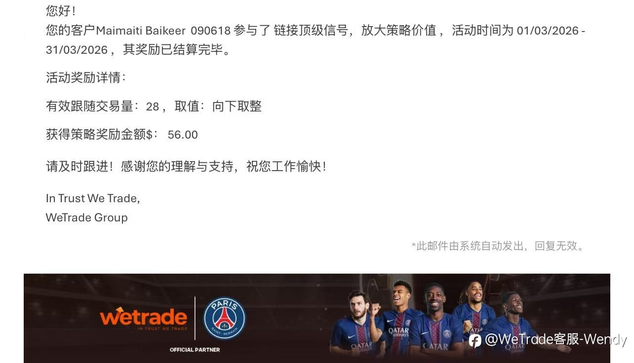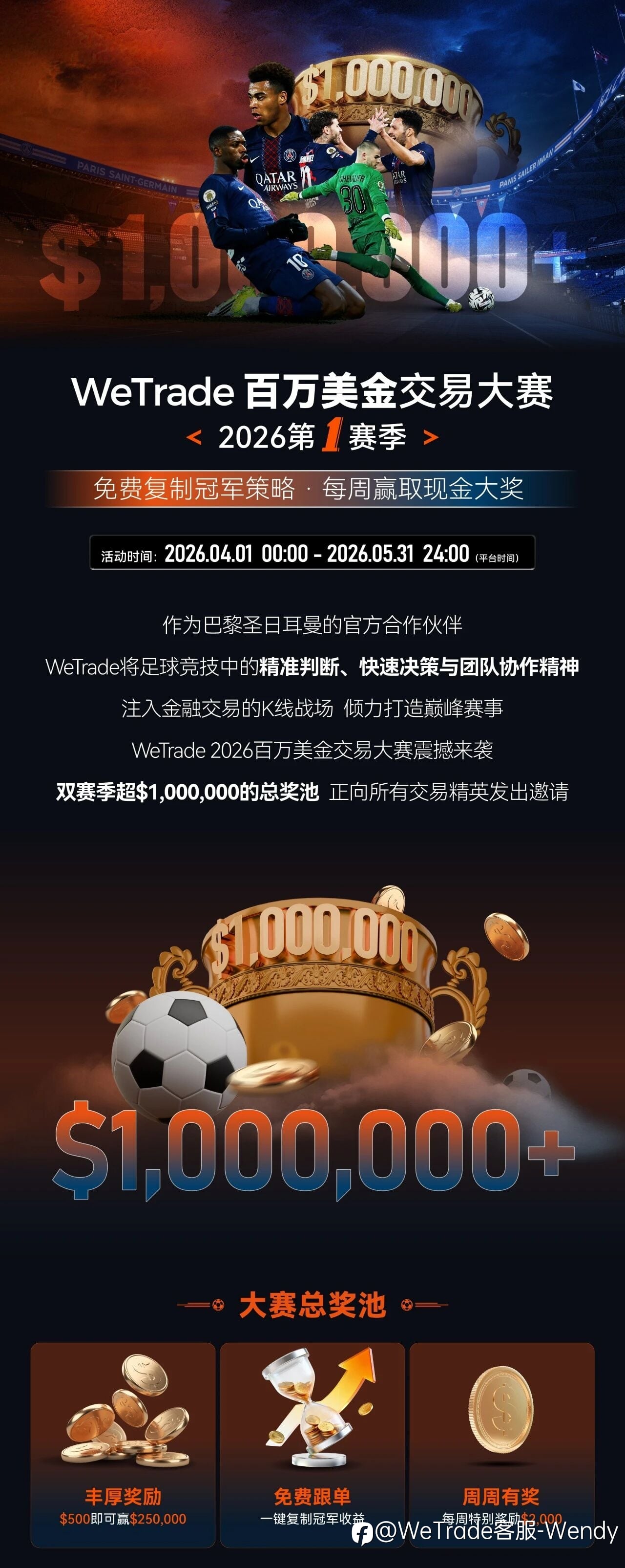 即刻加入 WeTrade 2026 模拟交易大赛第三赛季,让激情与理性并肩,让策略与纪律共振,以您的交易实力,向$5000 现金大奖 + 巴黎圣日耳曼限量版球衣发起冲击。