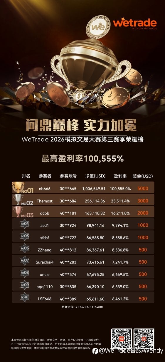 巅峰已现,强者登榜🏆 WeTrade 2026模拟交易大赛第三赛季完美落幕 冠军选手@nb666 以 100,555% 盈利率 强势封神🔥 📊 百万美金交易大赛 2026第一赛季已开赛 💰 $500赢最高$250,000奖金 🚀 免费跟单高手...