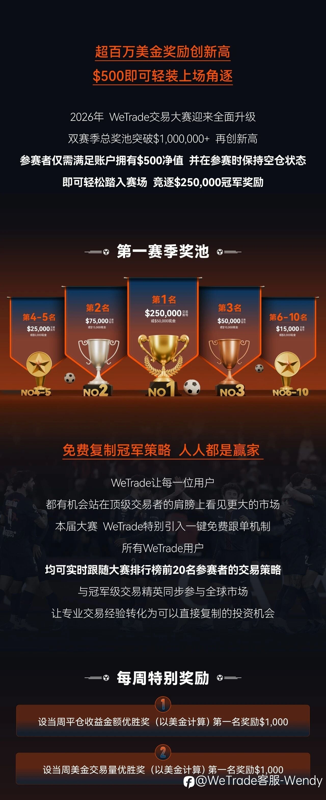 WeTrade百万美金交易大赛即将重磅开启! 百万美金赛场,冠军只等您登场 ⚽🔥 2026第1赛季来袭,争夺$1,000,000+奖金池 💰 📅 4月1日正式开赛 🚀 一键跟单 · 周周有奖 · 高额回报 定好闹钟,用实力...