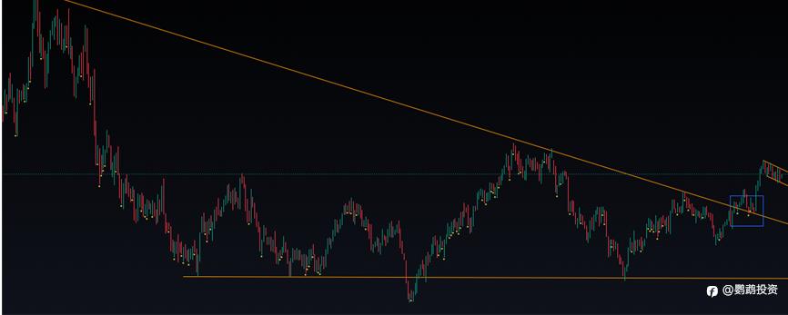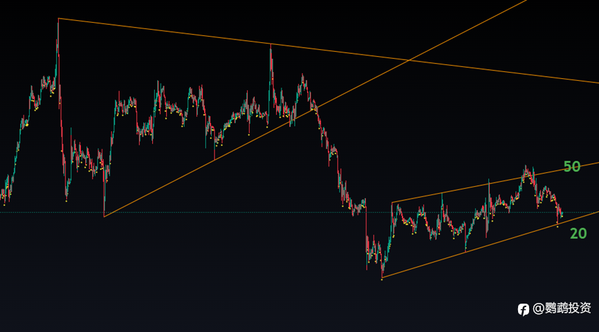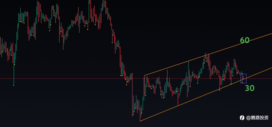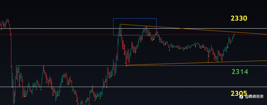 黄金周四突破区间内可见上涨旗形结构阻力,接续发展,于周五踩住2283-2330震荡区间后向上释放。但此程度超过预期,一波完成,连续越过多个水平关键位45、64。按区间距离等比直接释放完成,恰好到达此前所绘趋势线2378附近反转。 目前动能已全部释放,现处范围较为真空,不排除持续回撤、或于高位区间宽幅震荡后再发展的可能。2364或成为日内关键位,围绕其反复。 下方位置在2340-2345,进一步在2325-2330。上方可看到2378上周前高。进一步在2430历史新高附近。 现时间段内结构可靠性不高,不好说行情遇其位置可产生可靠的发展。结构或随行情发展变化再固定。
