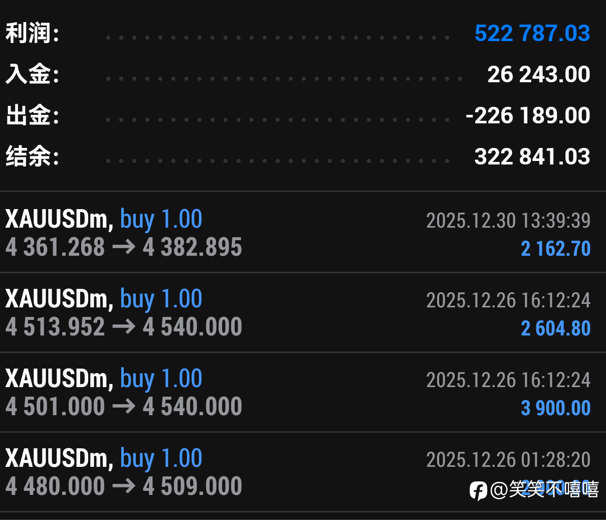 2026近在咫尺,全球很多地方沉浸在圣诞节的欢乐氛围中,消费者今年最后一场狂欢拉开序幕。 EBC跟单社区同样一片祥和,@ TradingEdge1在默默耕耘近3个月后,一跃成为最炙手可热的信号,跟随数量上百,AUC规模达到26万美元左右。 截至目前为止,他的收益率超8倍,只有一笔在持订单,盈利曲线上看上去非常平滑,从标准差指标就能看出风控做得不错。 最令人诧异的是,无论交易什么,他几百个订单全部为做多,乍看之下,这种单向操作有些不太合理。 从品种看,逻辑一下子变得清晰起来,纳斯达克100指数、美元兑日元、贵金属均处于长期上涨趋势中,让市