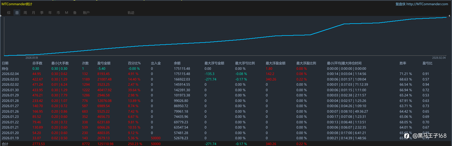 每天跟新交易情况,无惧500美金大跌行情;团队历时五年自研EA,不是那种各大社区免费EA; 三周四倍,五万账户只开0.2手,最大回撤10%以内 新增一万账户,2月9号开跑 观摩账号 MT5 账号:81076932 密码:Jl202601.(最后一位是小数点) 服务器:ECmarkets-MT5-Live01