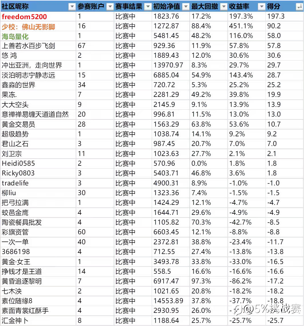 一转眼,2026年又过去了十天。 黄金继续发烧,周五收盘再次落到4500上方,并且在周一继续遥遥领先。 5%挑战赛排名变化不大,飞剑取代海岛量化,来到了第三名。 但整体积分超过100的,依然只有第一名。 另外,又有几位参赛选手遗憾淘汰,可见取得良好盈利的同时能保持小亏,非常不容易。 最近交易频率下滑后,我逐渐醒悟的重要一点:追逐他人成功是个灾难。 这就是困惑我长达十几年的事。 交易里,不断去追逐他人的成功,很少去真正清晰感受到自己的舒适区。 于是从日内短线换到波段,或者长线,又学习套利,量化,资金管理。 对于他人似乎都能成功的事情,自己学了就更废。 社区有不少小伙伴