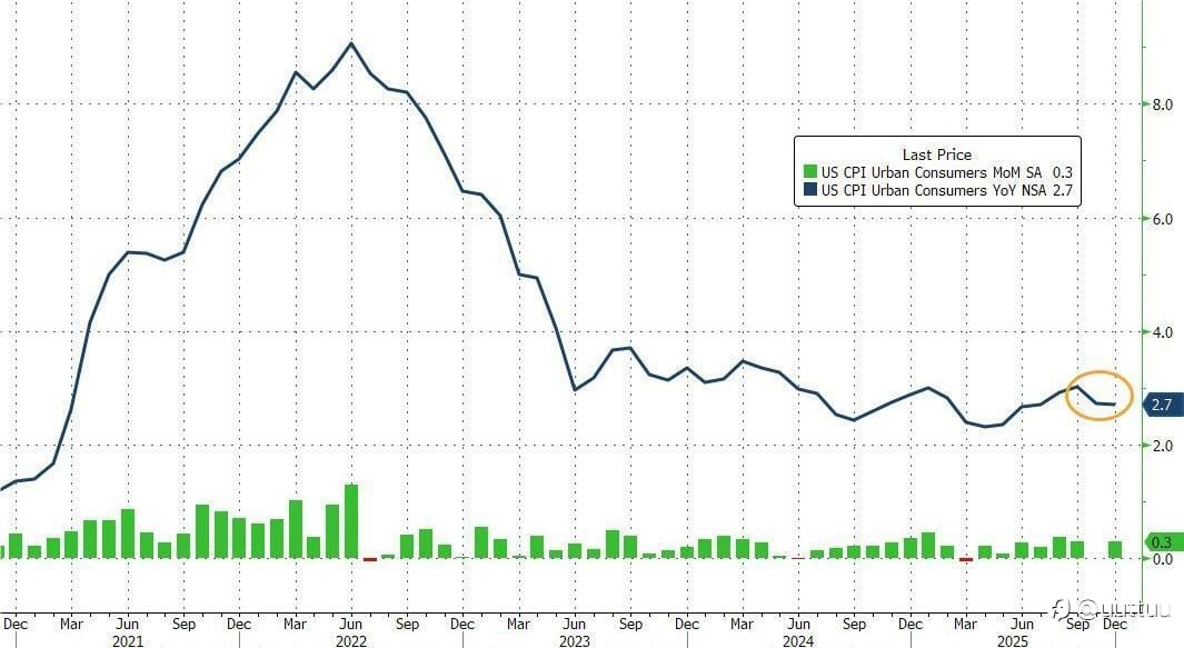 美国劳工统计局(BLS)公布的数据显示,整体消费者物价指数(CPI)基本符合预期,而核心通胀低于预期,使美联储仍倾向于进一步放松货币政策。周二(1月13日)美盘时段,现货黄金价格攀升至4634.25美元/盎司的历史高点后涨幅收窄。周三(北京时间1月14日)亚市早盘,现货黄金交投于4595美元/盎司附近。 一、美国12月CPI符合预期 美国12月CPI同比环比均符合预期,核心CPI环同比双双低于预期,表明当前通胀正在进一步放缓。 周二,美国劳工统计局公布数据显示:美国12月CPI同比增长2.7%,持平预期,同时持平于前月四年来最低水平。美国12月CPI环比0.3%,持平预期和前值。核心CPI同比