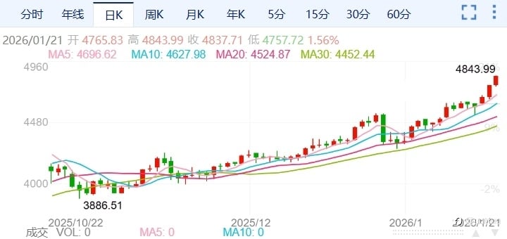 现货黄金价格周一(1月26日)延续涨势,历史上首次突破每盎司5000美元关键关口,截止07:40,盘中最高触及5031.58美元,再创历史纪录,涨幅约0.9%。有分析师预测,今年黄金价格可能进一步攀升至每盎司6400美元高位,年均价或达5375美元。在当前多因素共振的背景下,黄金作为避险资产与货币属性载体的吸引力或将继续凸显。 一、格陵兰摩擦、伊朗危机 当前金价飙升的核心引擎无疑是地缘政治风险的急剧升级。美国与北约围绕格陵兰岛主权及“准入权限”的公开对峙,直接撕裂了美欧传统盟友关系,市场迅速解读为西方阵营内部裂痕加深,全球金融格局面临重构风险。 与此同时,中东局势同步恶化:美国对伊朗祭出新一轮