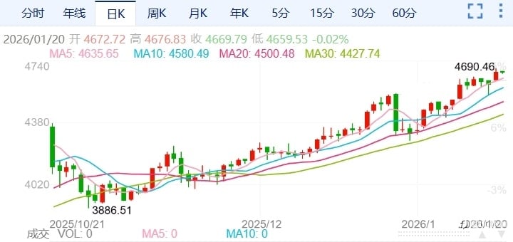 特朗普引发的格陵兰岛争端直接点燃了避险资产的火爆行情,周一(1月19日)现货金价一度飙升至每盎司4690.46美元的纪录新高,投资者们在不确定性中纷纷转向黄金,这种避险需求不仅推高了贵金属价格,还暴露了全球经济潜在的脆弱性。周二(1月20日)亚市早盘,现货黄金高位震荡,交投于4670美元/盎司附近。 一、关税激发避险情绪 相关分析指出,特朗普总统任期内,美国的关税政策非常频繁且具有反复性,涉及多个方面,包括与地缘敏感地区的矿产金属贸易关系。尽管2025年已经表现出紧张和博弈加剧的态势,但预计2026年这些关系仍将存在反复,需要持续关注。近期华尔街频繁上调黄金目标价,其中美银和摩根大通认为金价有