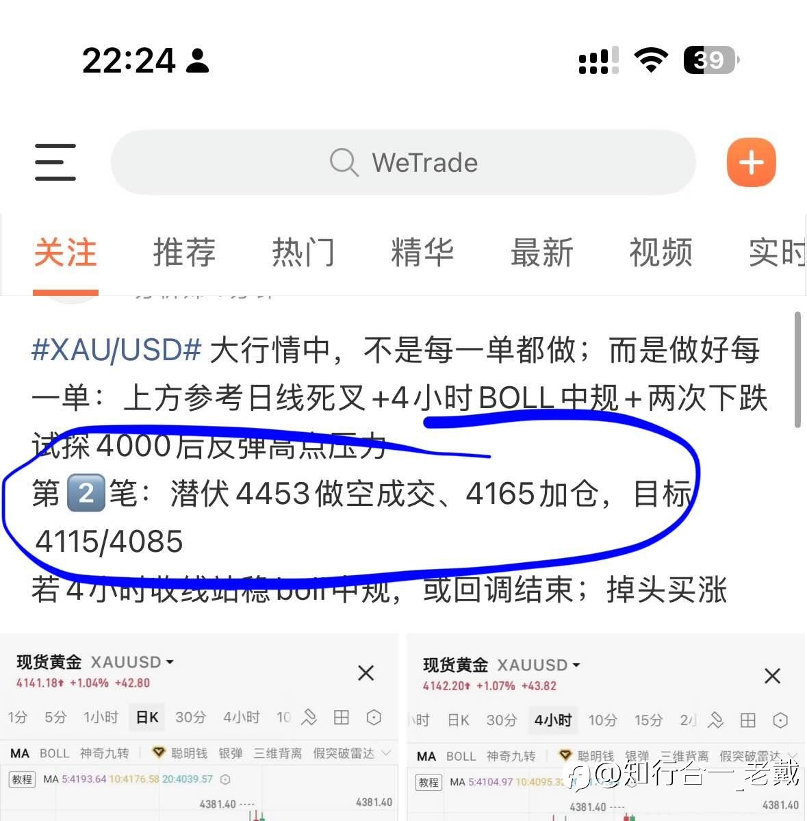 隔夜空单短线止盈减仓,等待波段目标 周四尾盘4153抄顶短线止盈4115,拿下38$行情减仓 等待波段目标4085 周四早盘老戴明确支撑+阻力,思路明确,计划清晰,执行到位,多空完美兑现 敲黑板:...