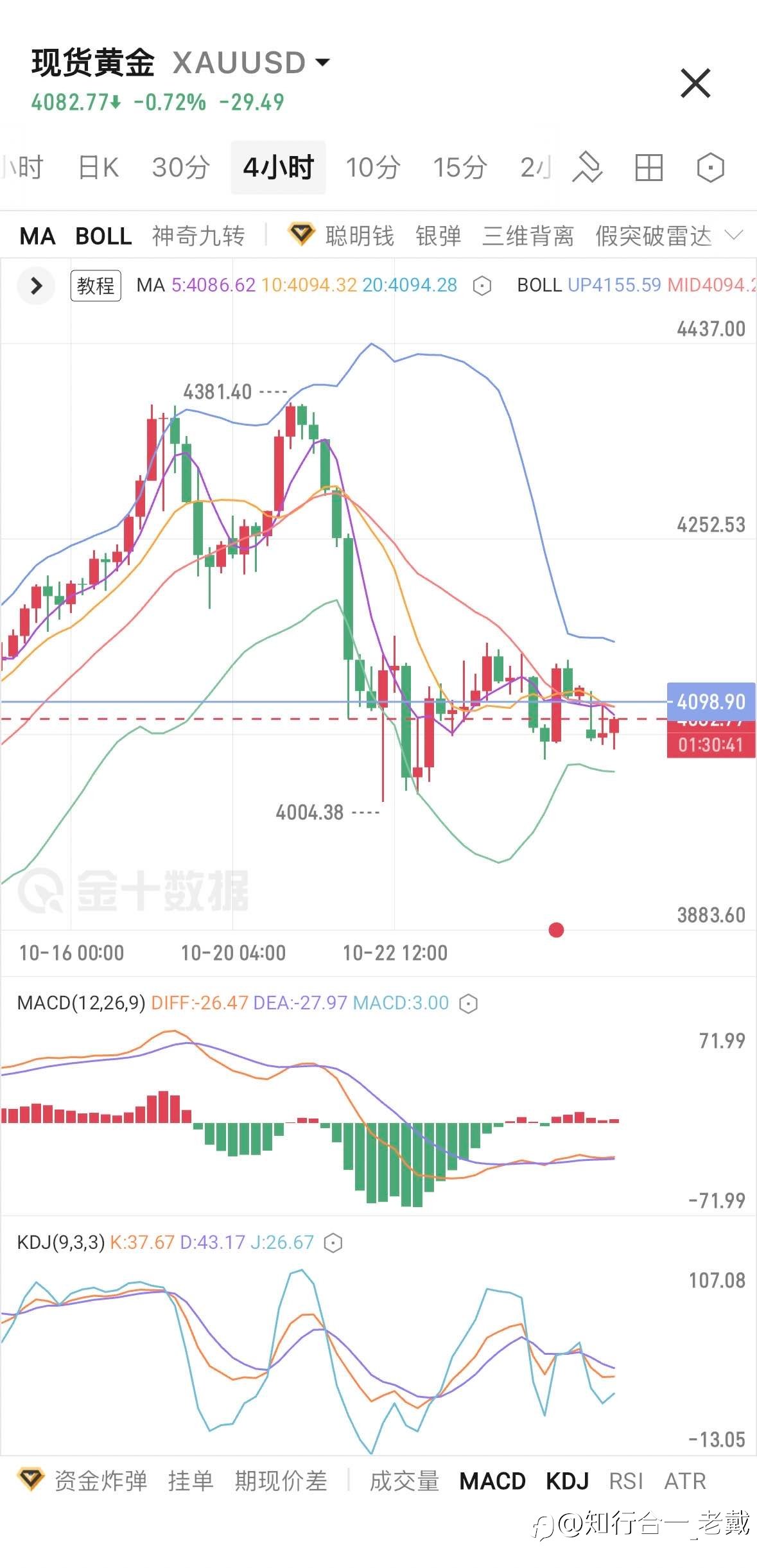 午盘黄金再次试探MA20获得支撑,符合老戴早盘思路:目前上方短线压力4100位置【4小时BOLL中轨】 4060/75多现价4082拿下17$继续持有,短线目标调整到4095 收复4100在看高一线