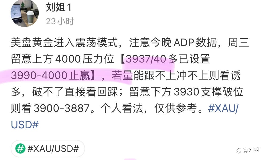 刘姐3940/47买涨,现价3954,持赢14个点,目标3965-90不变。